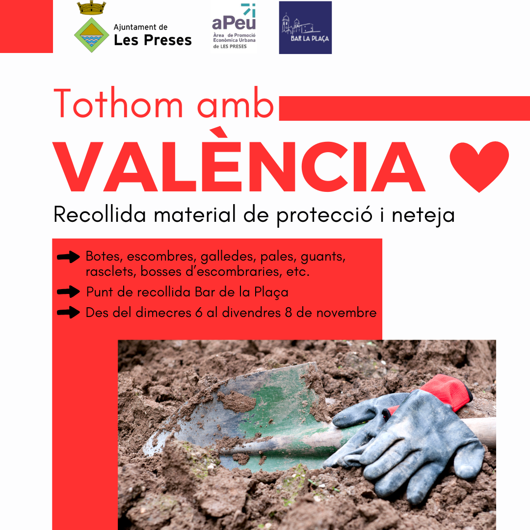 El més necessari i essencial en aquest moment portar material de protecció com botes, pales, escombres, guants i roba protectora. El punt de recollida és el bar La Plaça de les Preses.