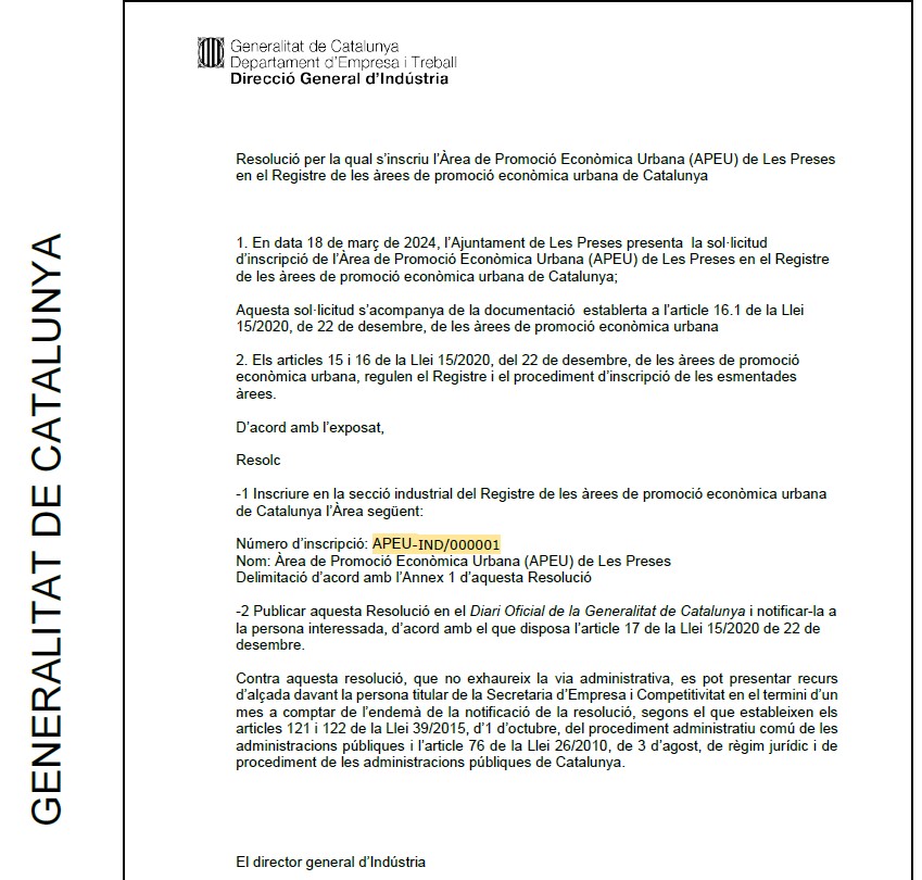 Amb aquest pas, el polígon de la Preses, junt amb el seu Ajuntament reforça el seu lideratge en innovació econòmica i urbanística.